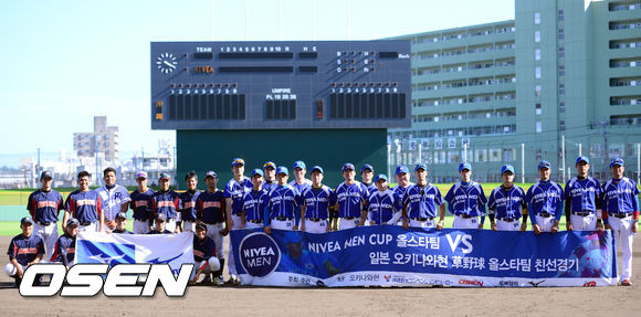 30일 오후 일본 오키나와 나하시 셀룰러 스타디움에서 열린 '제4회 니베아 맨 컵 전국생활체육야구대회 스페셜 이벤트 한-일 사회인야구 드림리그' 경기에 앞서 양팀 선수들이 포토타임을 갖고 있다.