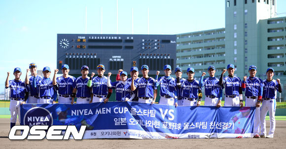 30일 오후 일본 오키나와 나하시 셀룰러 스타디움에서 열린 '제4회 니베아 맨 컵 전국생활체육야구대회 스페셜 이벤트 한-일 사회인야구 드림리그' 경기에 앞서 니베아 맨 올스타팀이 기념촬영을 하고 있다.