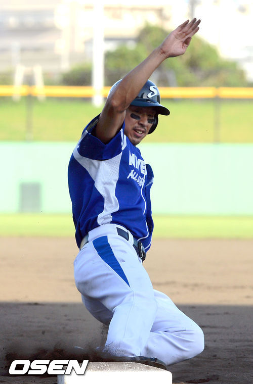 30일 오후 일본 오키나와 나하시 셀룰러 스타디움에서 열린 '제4회 니베아 맨 컵 전국생활체육야구대회 스페셜 이벤트 한-일 사회인야구 드림리그' 경기 2회말 무사 1루에서 정진우의 외야 플라이때 1루주자 강경민이 급히 1루로 귀루하고 있다.