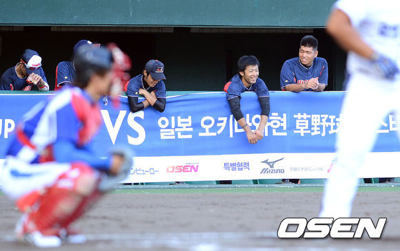 30일 오후 일본 오키나와 나하시 셀룰러 스타디움에서 열린 '제4회 니베아 맨 컵 전국생활체육야구대회 스페셜 이벤트 한-일 사회인야구 드림리그' 경기, 2회초 일본 올스타팀이 덕아웃에서 경기를 지켜보고 있다.