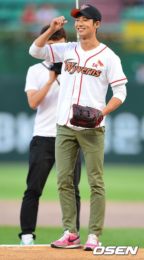 가수 오종혁이 시구자로 나서 야구팬들에게 인사하고 있다.