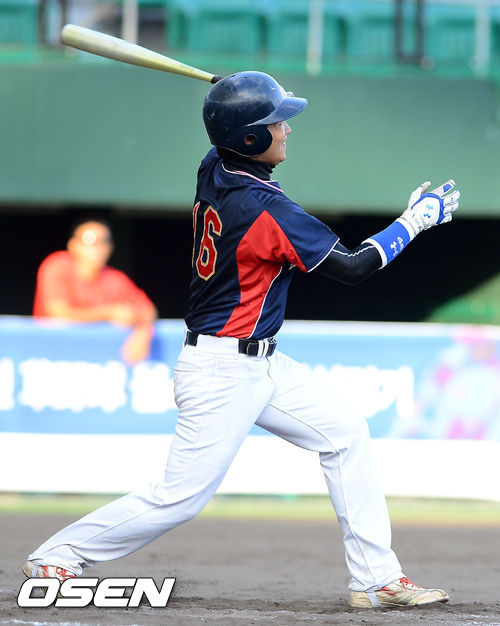 30일 오후 일본 오키나와 나하시 셀룰러 스타디움에서 열린 '제4회 니베아 맨 컵 전국생활체육야구대회 스페셜 이벤트 한-일 사회인야구 드림리그' 경기, 4회초 무사2루에서 오키나와 연합팀 토야마가 투런홈런을 날리고 있다.