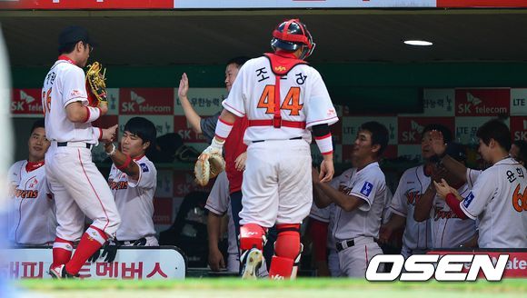 3회초 삼성 공격 2사 1루 상황 강봉규의 1루수 방면 빠른 타구를 멋지게 잡아낸 SK 1루구 박정권이 더그아웃으로 들어오며 동료들과 인사를 나누고 있다.