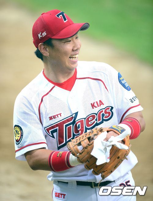 30일 오후 광주 무등경기장에서 열린 '2013 한국야쿠르트 세븐 프로야구' KIA 타이거즈와 넥센 히어로즈의 경기, 경기에 앞서 KIA 이범호가 몸을 풀며 미소짓고 있다.
