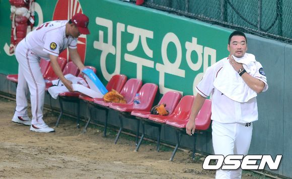 30일 오후 광주 무등경기장에서 열린 '2013 한국야쿠르트 세븐 프로야구' KIA 타이거즈와 넥센 히어로즈의 경기, 1회초 1실점을 허용한 KIA 김진우가 불펜에서 땀을 닦고 있다.