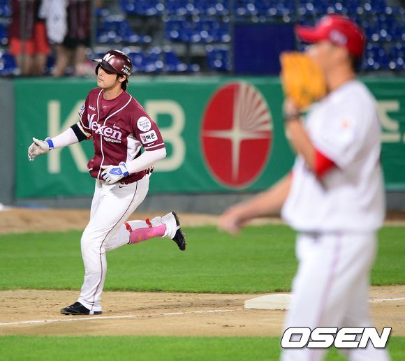 30일 오후 광주 무등경기장에서 열린 '2013 한국야쿠르트 세븐 프로야구' KIA 타이거즈와 넥센 히어로즈의 경기, 5회초 넥센 서동욱이 역전 솔로포를 그라운드를 돌고 있다