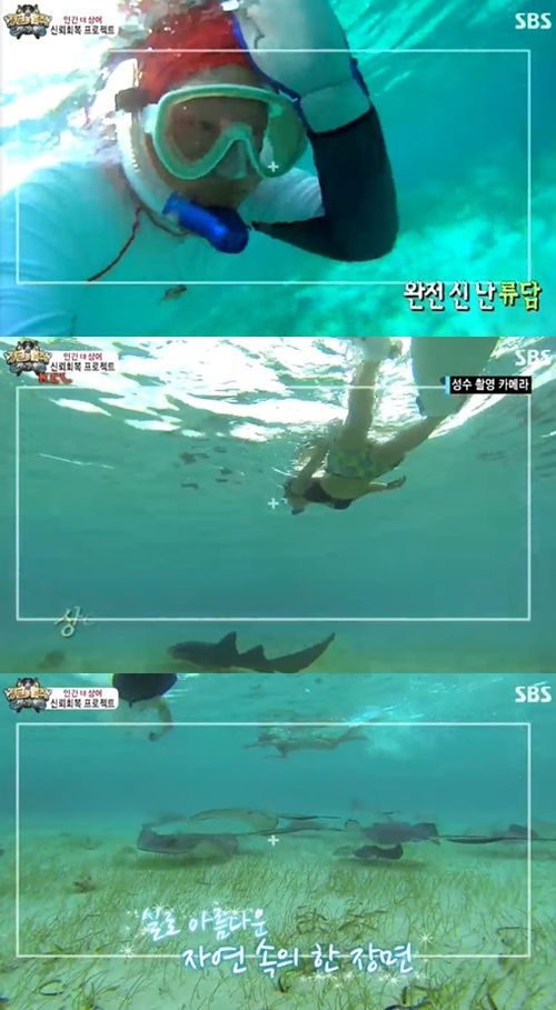 병만족은 수염상어와 가오리떼를 발견하고는 그들과 함께 수영해 눈길을 끌었다.
