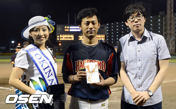 경기종료, 미스 오키나와 야마다 미나미와 오키나와현 연합팀 주장, 주최사 니베아 맨 의 김병일 과장이 기념촬영을 하고 있다. /ouxou@osen.co.kr