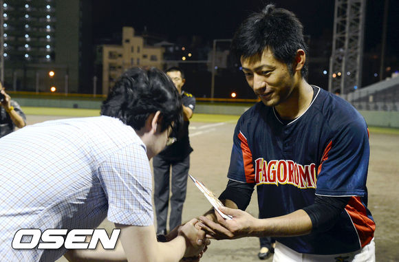 경기종료, 우승팀 오키나와현 연합팀 주장이 주최사인 니베아 맨의 김병일 과장으로 부터 상금을 전달 받고 있다./ouxou@osen.co.kr