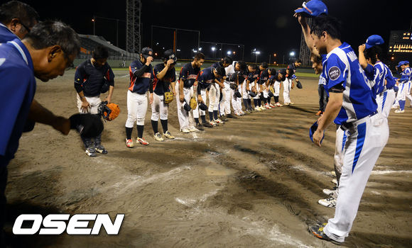 경기종료, 오키나와 현 연합팀 선수들과 니베아 맨 선수들이 인사를 나누고 있다. /ouxou@osen.co.kr