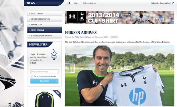 토트넘은 31일(이하 한국시간) 공식 홈페이지를 통해 "아약스로부터 에릭센을 영입했다"고 발표했다. 공격형 미드필더로 지난 2008년 아약스에서 데뷔한 에릭센은 총 161경기에 출전, 33골을 넣으며 팀의 주축으로 활약했다. 또한 덴마크 국가대표팀에서도 맹활약하며 맨체스터 시티 등 유럽 빅클럽들의 관심을 모았던 선수다.