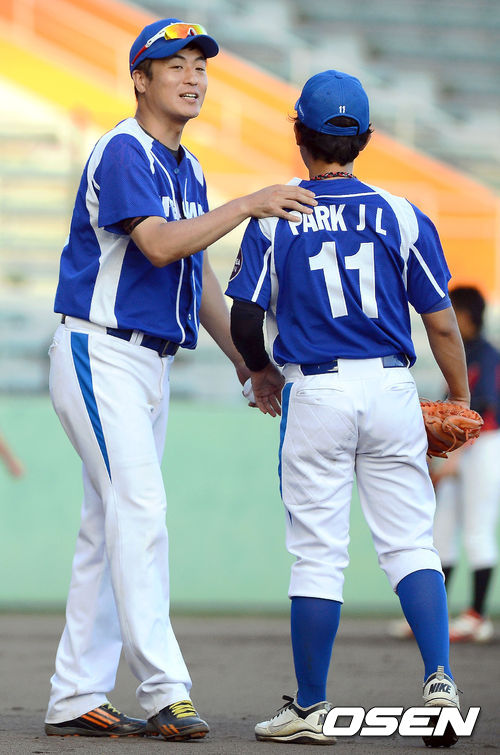 4회초, 니베아 맨 올스타팀 감독 문순환이 투수 박종림을 격려하고 있다. /ouxou@osen.co.kr