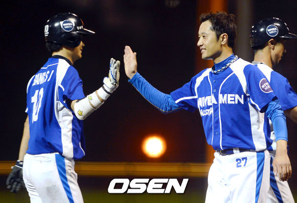 6회말 공격에서 니베아 맨 올스타팀이 2점을 뽑아 희망의 불씨를 당기자 정진우가 득점주자들과 하이파이브를 하고 있다. /ouxou@osen.co.kr