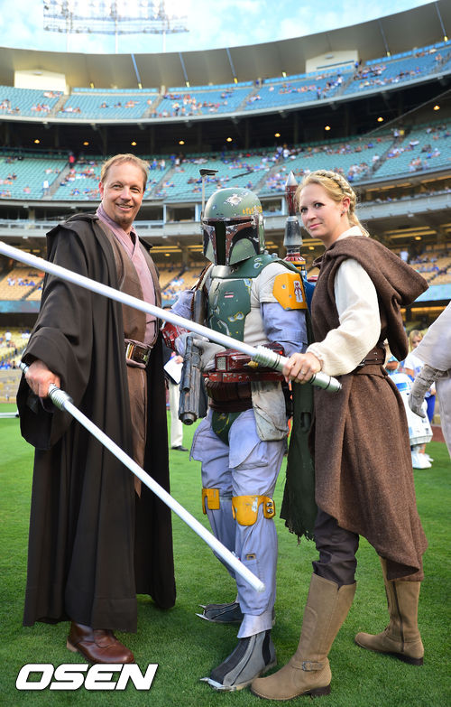 31일 (이하 한국시간) 미국 캘리포니아주 로스앤젤레스 다저스타디움에서 2013 메이저리그 LA 다저스와 샌디에이고 파드리스 경기에 앞서서 스타워즈 코스프레 행사가 열리고 있다.