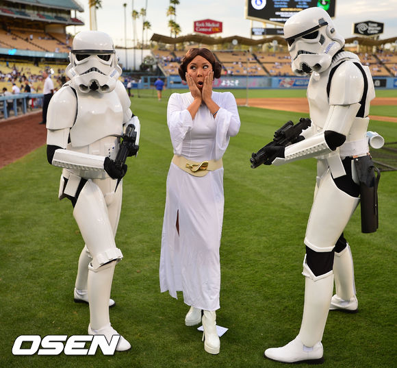 31일 (이하 한국시간) 미국 캘리포니아주 로스앤젤레스 다저스타디움에서 2013 메이저리그 LA 다저스와 샌디에이고 파드리스 경기에 앞서서 스타워즈 코스프레 행사가 열리고 있다.