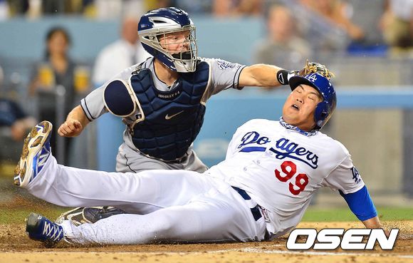 31일 (이하 한국시간) 미국 캘리포니아주 로스앤젤레스 다저스타디움에서 열린 2013 메이저리그 LA 다저스와 샌디에이고 파드리스 경기, 2회말 다저스 공격 2사 2루 상황 주자 류현진이 푸이그의 유격수 키를 넘기는 안타 때 홈으로 슬라이딩 해 세이프되고 있다.