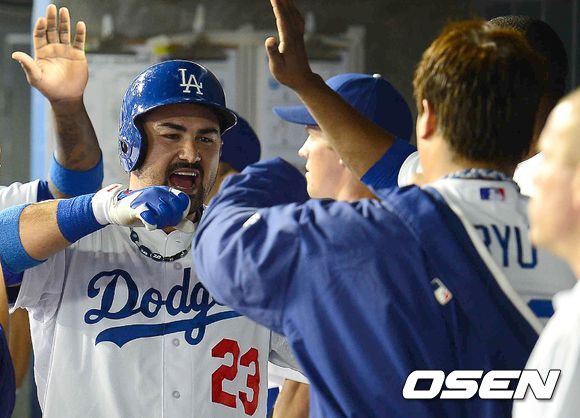 31일 (이하 한국시간) 미국 캘리포니아주 로스앤젤레스 다저스타디움에서 열린 2013 메이저리그 LA 다저스와 샌디에이고 파드리스 경기, 3회말 다저스 공격 무사 2루 상황 곤살레스 좌월 투런포를 날리고 더그아웃으로 들어와 류현진과 인사를 나누고 있다.