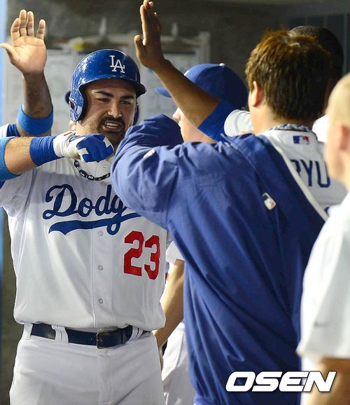 31일 (이하 한국시간) 미국 캘리포니아주 로스앤젤레스 다저스타디움에서 열린 2013 메이저리그 LA 다저스와 샌디에이고 파드리스 경기, 3회말 다저스 공격 무사 2루 상황 곤살레스 좌월 투런포를 날리고 더그아웃으로 들어와 류현진과 인사를 나누고 있다.
