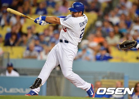31일 (이하 한국시간) 미국 캘리포니아주 로스앤젤레스 다저스타디움에서 열린 2013 메이저리그 LA 다저스와 샌디에이고 파드리스 경기, 3회말 다저스 공격 무사 2루 상황 곤살레스가 좌월 투런포를 날리고 있다.