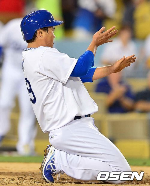 31일 (이하 한국시간) 미국 캘리포니아주 로스앤젤레스 다저스타디움에서 열린 2013 메이저리그 LA 다저스와 샌디에이고 파드리스 경기, 2회말 다저스 공격 2사 2루 때 홈으로 쇄도해 세이프 된 뒤 손에 묻은 흙먼지를 털고 있다.