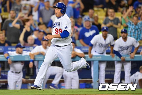 2회말 다저스 공격 2사 2루 상황 푸이그의 안타 때 주자 류현진이 홈으로 쇄도하고 있다.
