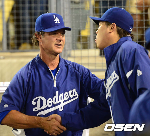 7회초 마운드에 내려온 다저스 류현진이 이닝을 마치고 돈 매팅리 감독과 악수를 나누고 있다.