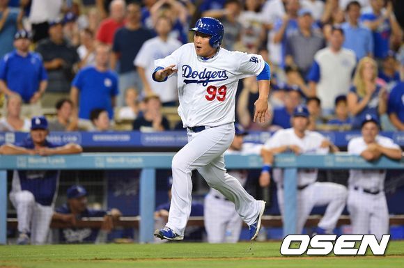 2회말 다저스 공격 2사 2루 상황 푸이그의 안타 때 주자 류현진이 홈으로 쇄도하고 있다.