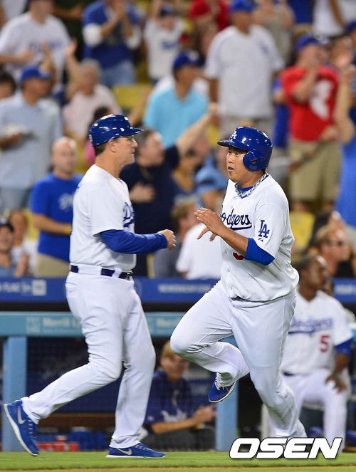 2회말 다저스 공격 2사 2루 상황 푸이그의 안타 때 주자 류현진이 3루를 돌아 홈으로 쇄도하고 있다.