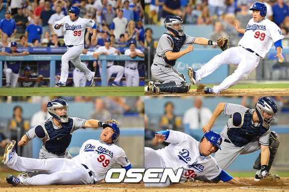 이후 류현진은 푸이그의 좌전 안타 때 3루를 돌아 홈까지 파고 들었고 상대 송구가 제대로 연결되지 않는 사이 득점을 기록했다.2회말 다저스 공격 2사 2루 상황 주자 류현진이 푸이그의 유격수 키를 넘기는 안타 때 홈으로 슬라이딩 해 세이프되고 있다.