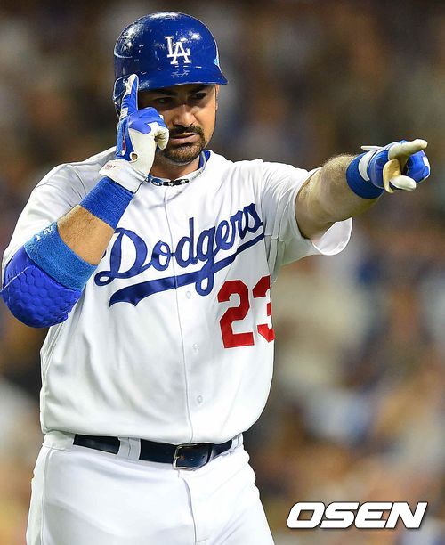 7회말 다저스 공격 무사 2루 상황 곤살레스가 투런포를 날리고 기쁨의 세레모니를 펼치고 있다./ rumi@osen.co.kr
