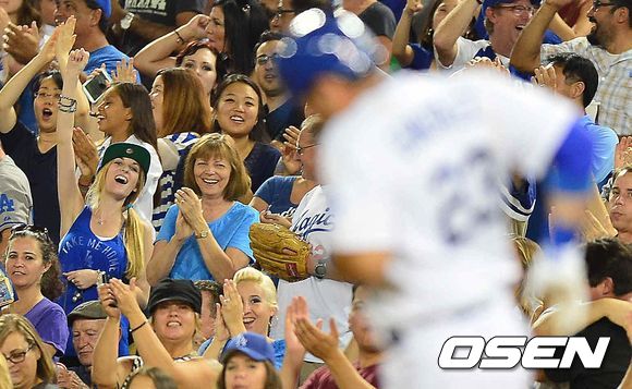 7회말 다저스 공격 무사 2루 상황 곤살레스가 투런포를 날리고 다저스 팬들의 환호를 받으며 그라운드를 돌고 있다./ rumi@osen.co.kr