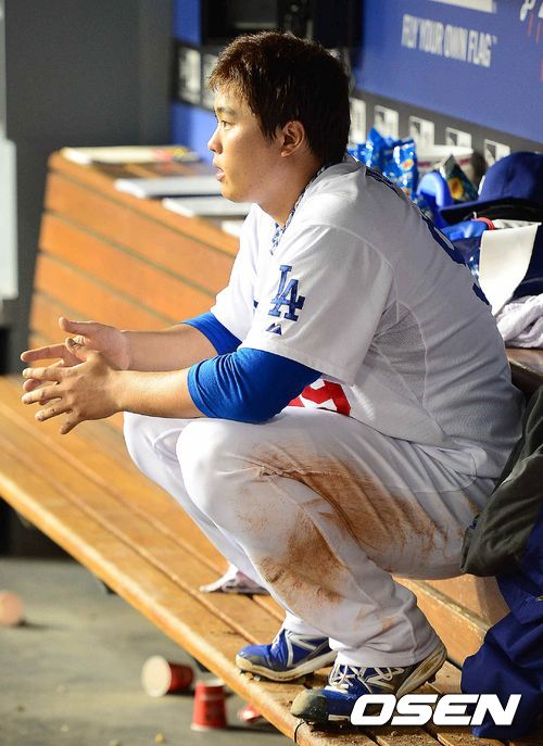 7회초 1사 1, 2루 상황 마운드를 내려온 류현진이 더그아웃 벤치에 앉아 경기를 지켜보고 있다./ rumi@osen.co.kr