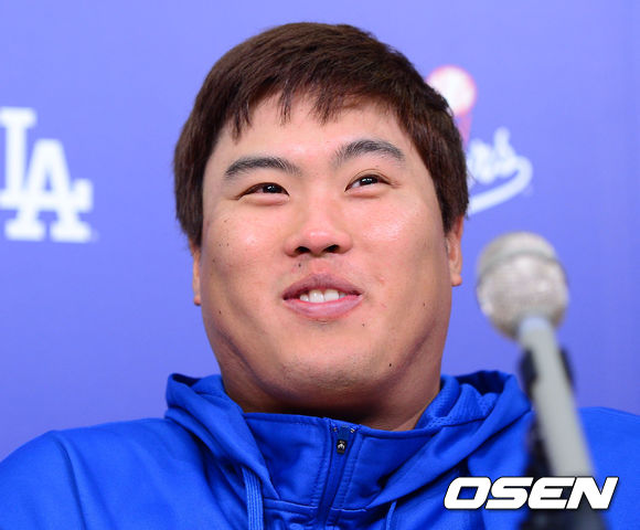 경기를 마치고 류현진이 인터뷰 중 홈 쇄도에 대한 질문에 '부끄럽다'고 말하며 미소짓고 있다. / rumi@osen.co.kr