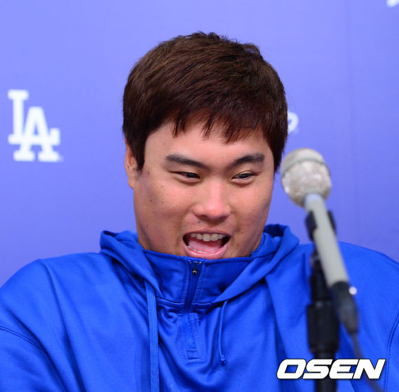경기를 마치고 류현진이 인터뷰 중 홈 쇄도에 대한 질문에 '부끄럽다'고 말하며 쑥스러워하고 있다. / rumi@osen.co.kr