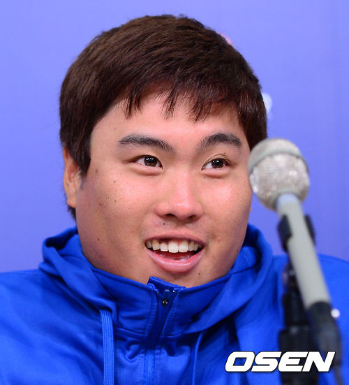 경기를 마치고 류현진이 인터뷰 중 홈 쇄도에 대한 질문에 쑥스러워하며 앞으로 슬라이딩 연습을 많이 하겠다고 답하고 있다. / rumi@osen.co.kr