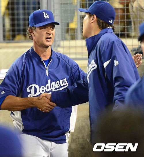 7회초 마운드를 내려온 다저스 선발 류현진이 매팅리 감독과 인사를 나누고 있다./ rumi@osen.co.kr