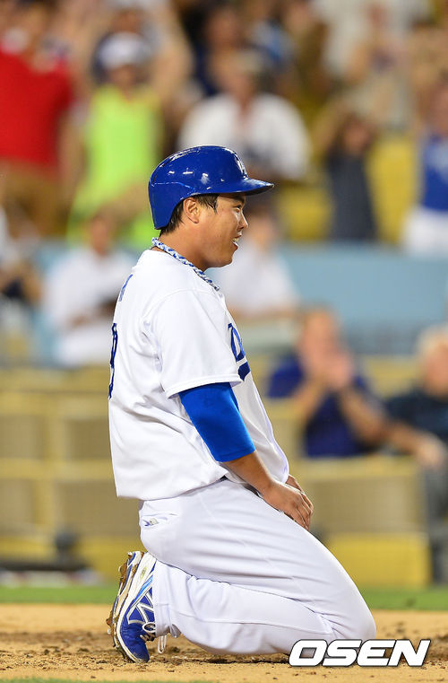 2회말 다저스 공격 2사 2루 때 홈으로 쇄도해 세이프 된 뒤 환하게 웃고 있다. / rumi@osen.co.kr