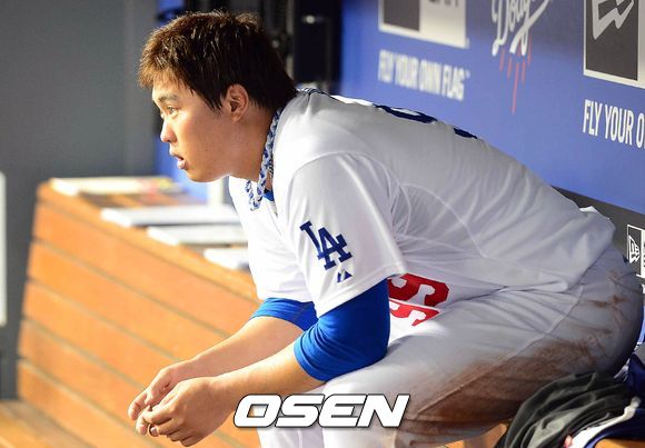 7회초 마운드를 내려온 다저스 선발 류현진이 더그아웃 벤치에 앉아 경기를 지켜보고 있다./ rumi@osen.co.kr