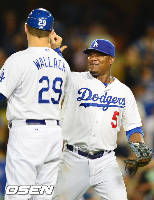 경기를 마치고 LA 다저스 유리베가 왈라치 코치와 하이파이브를 하고 있다. / rumi@osen.co.kr