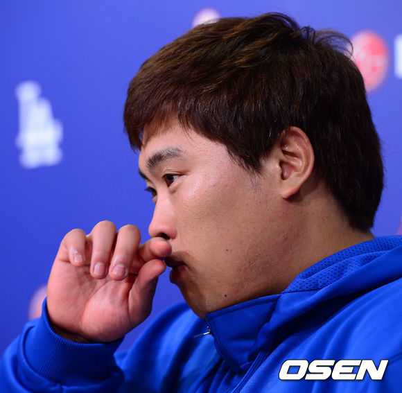 경기를 마치고 LA 다저스 류현진이 질문을 받으며 쑥스러워하고 있다. / rumi@osen.co.kr