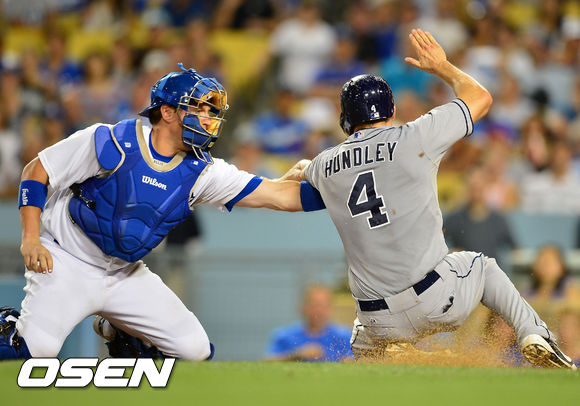 7회초 무사 주자 1,2루 샌디에이고 파드리스 아마리스타의 중전 안타때 2루 주자 허들리가 3루를 돌아 홈으로 쇄도했으나 LA 다저스 A.J 엘리스에게 태그아웃을 당하고 있다./ rumi@osen.co.kr