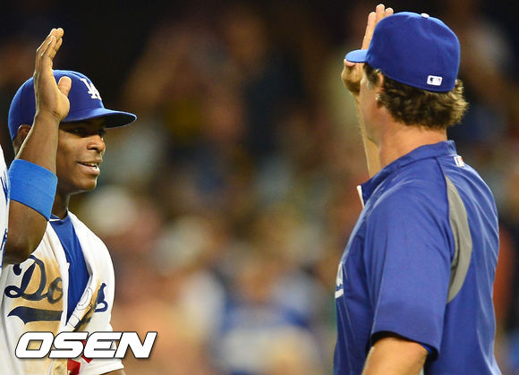 경기를 마치고 푸이그가 돈 매팅리 감독과 하이파이브를 하고 있다./ rumi@osen.co.kr