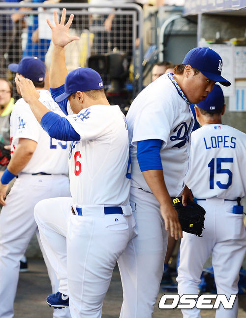 덕아웃에서 다저스 헤어스톤과 류현진이 몸을 충돌하며 하이파이브를 하고 있다./ rumi@osen.co.kr