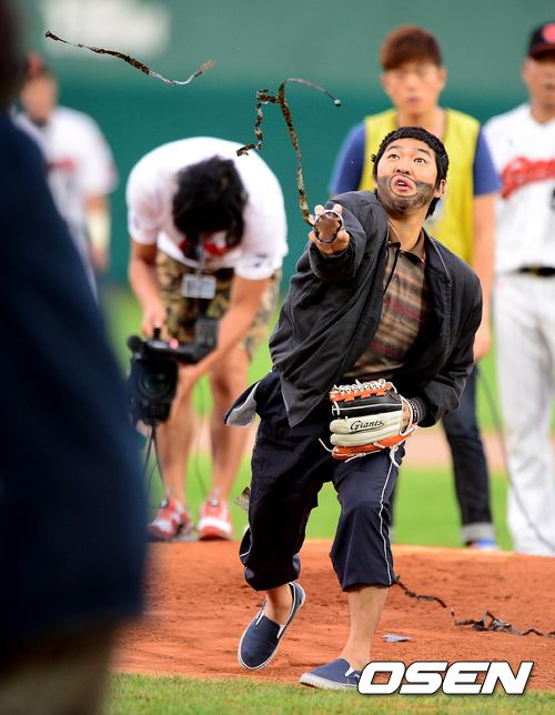 31일 오후 부산 사직야구장에서 열린 롯데 자이언츠와 LG 트윈스의 경기, 경기에 앞서 개그콘서트 '황해'의 홍인규가 시구자로 마운드에 올라 퍼포먼스를 하고 있다.
