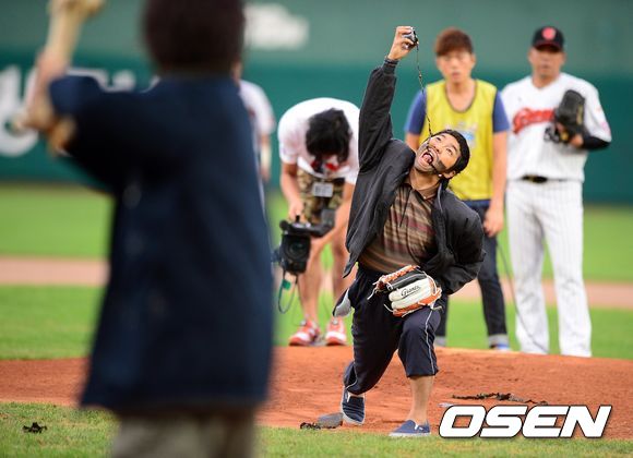 31일 오후 부산 사직야구장에서 열린 롯데 자이언츠와 LG 트윈스의 경기, 경기에 앞서 개그콘서트 '황해'의 홍인규 이상구가 시구 시타를 하고 있다.