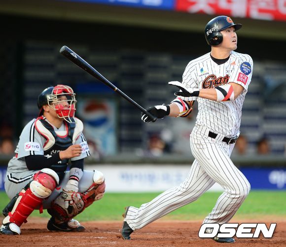 31일 오후 부산 사직야구장에서 열린 롯데 자이언츠와 LG 트윈스의 경기, 2회말 무사 1루에서 롯데 박종윤이 선제 1타점 적시 3루타를 날리고 타구를 바라보고 있다.