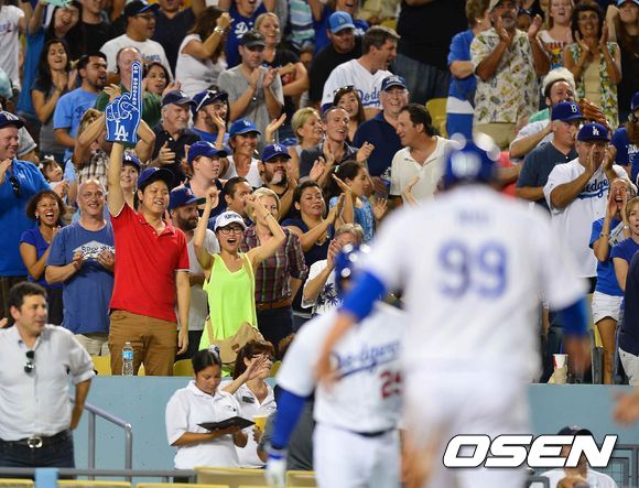 푸이그의 안타때 홈을 밟은 류현진에 팬들이 열렬한 박수를 보내고 있다. / rumi@osen.co.kr