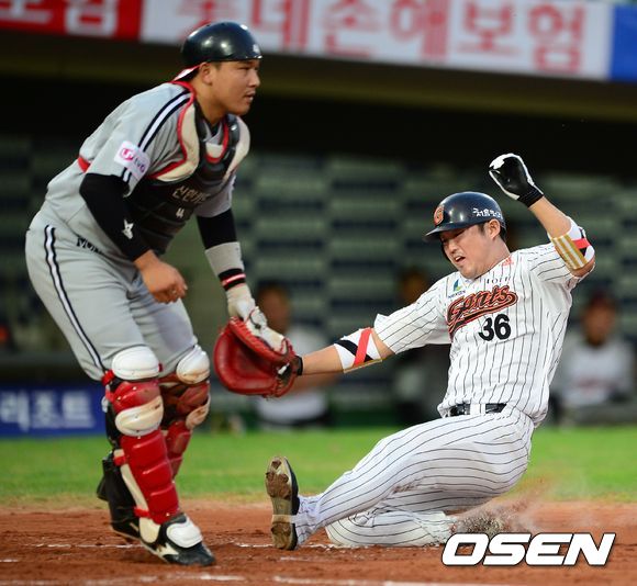 31일 오후 부산 사직야구장에서 열린 롯데 자이언츠와 LG 트윈스의 경기, 2회말 1사 1,3루에서 롯데 3루주자 박종윤이 정훈의 중견수 플라이에 태그업, 홈에서 세이프되고 있다.