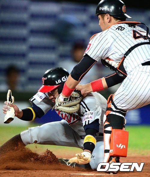 31일 오후 부산 사직야구장에서 열린 롯데 자이언츠와 LG 트윈스의 경기, 4회초 무사 2,3루에서 LG 정의윤의 1루수 땅볼에 3루주자 정성훈이 홈에서 롯데 강민호에 태그아웃당하고 있다.