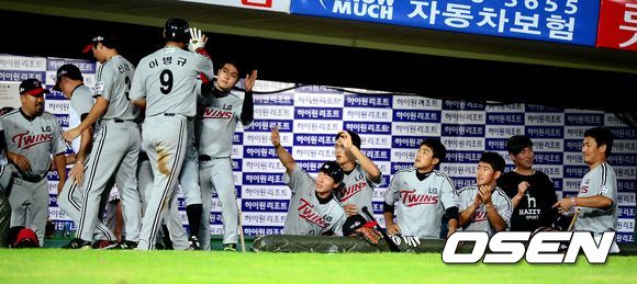 31일 오후 부산 사직야구장에서 열린 롯데 자이언츠와 LG 트윈스의 경기, 4회초 1사 1,3루에서 LG 오지환의 1타점 역전 좌전 적시타에 홈을 밟은 이병규가 더그아웃에서 동료선수들과 하이파이브를 하고 있다.